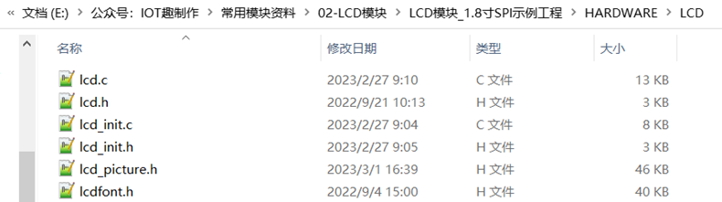 其中lcd.c、lcd.h、lcd_init.c、lcd_init.h完成的是LCD初始化基本配置与LCD的基本功能的实现,如修改引脚等。